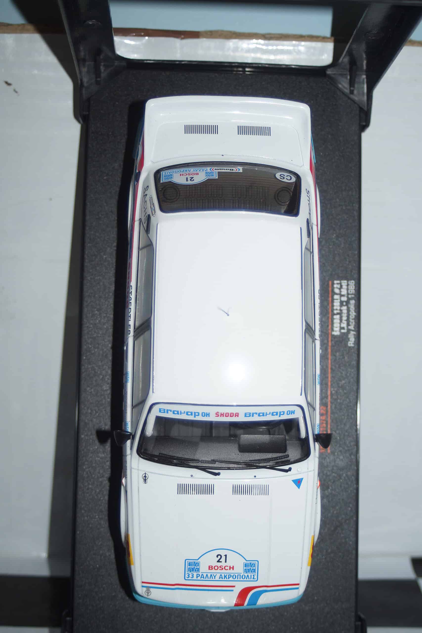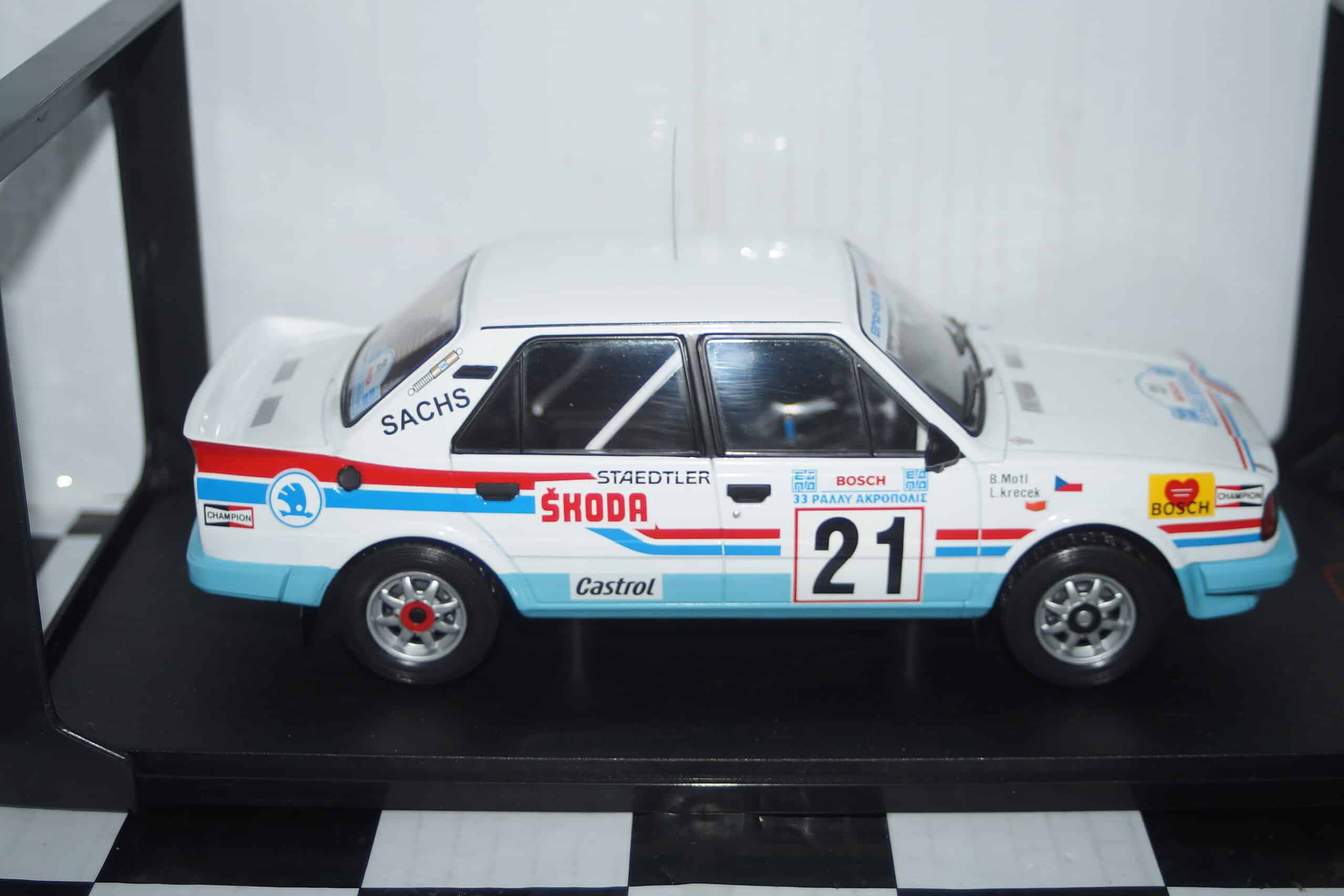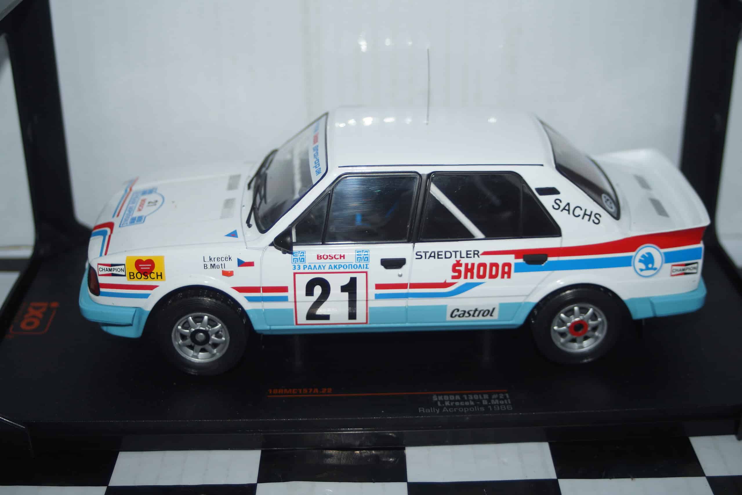 This model car is a collectors replica of a Skoda 130LR Rally Acropolis #21 1986 Driven by L.Krecek / B.Moti