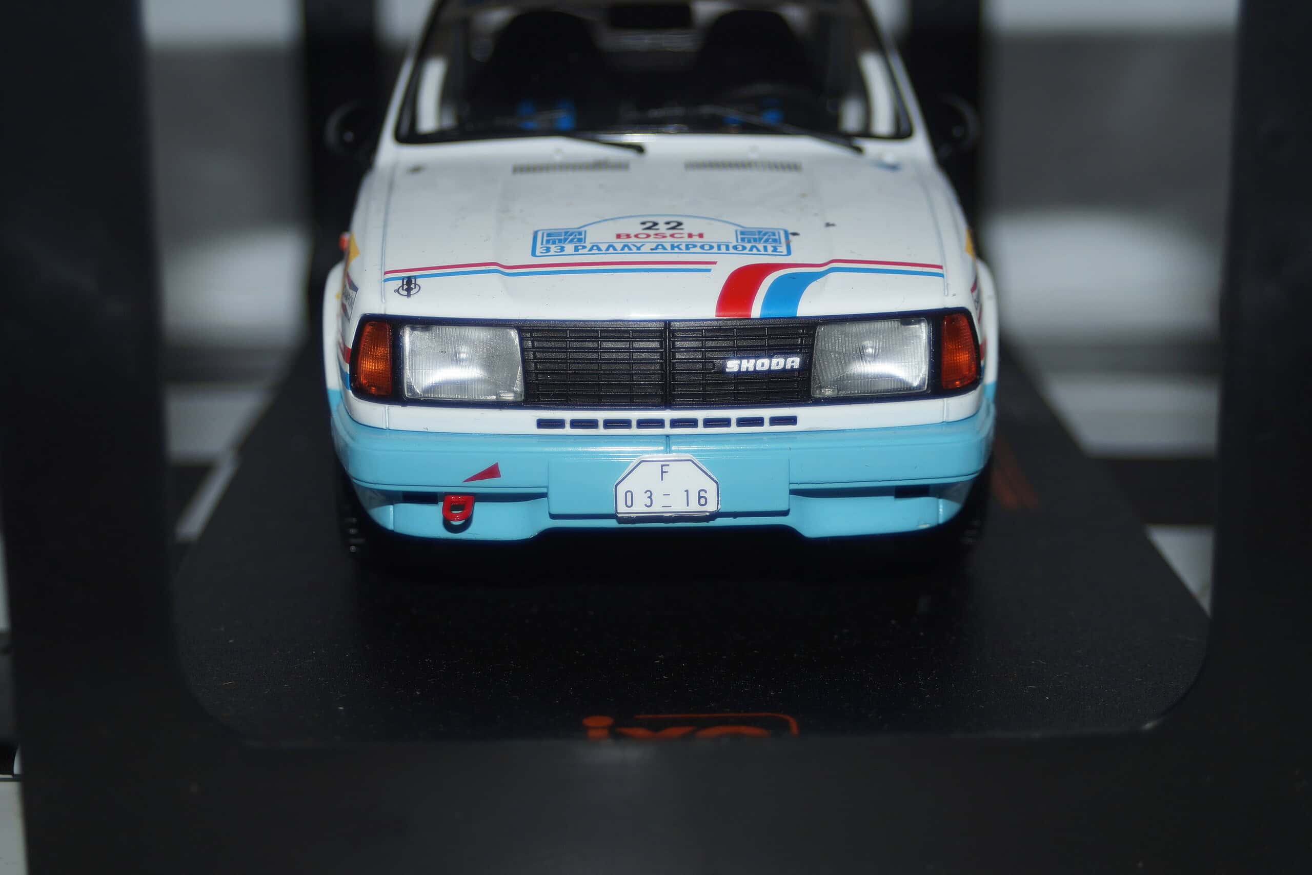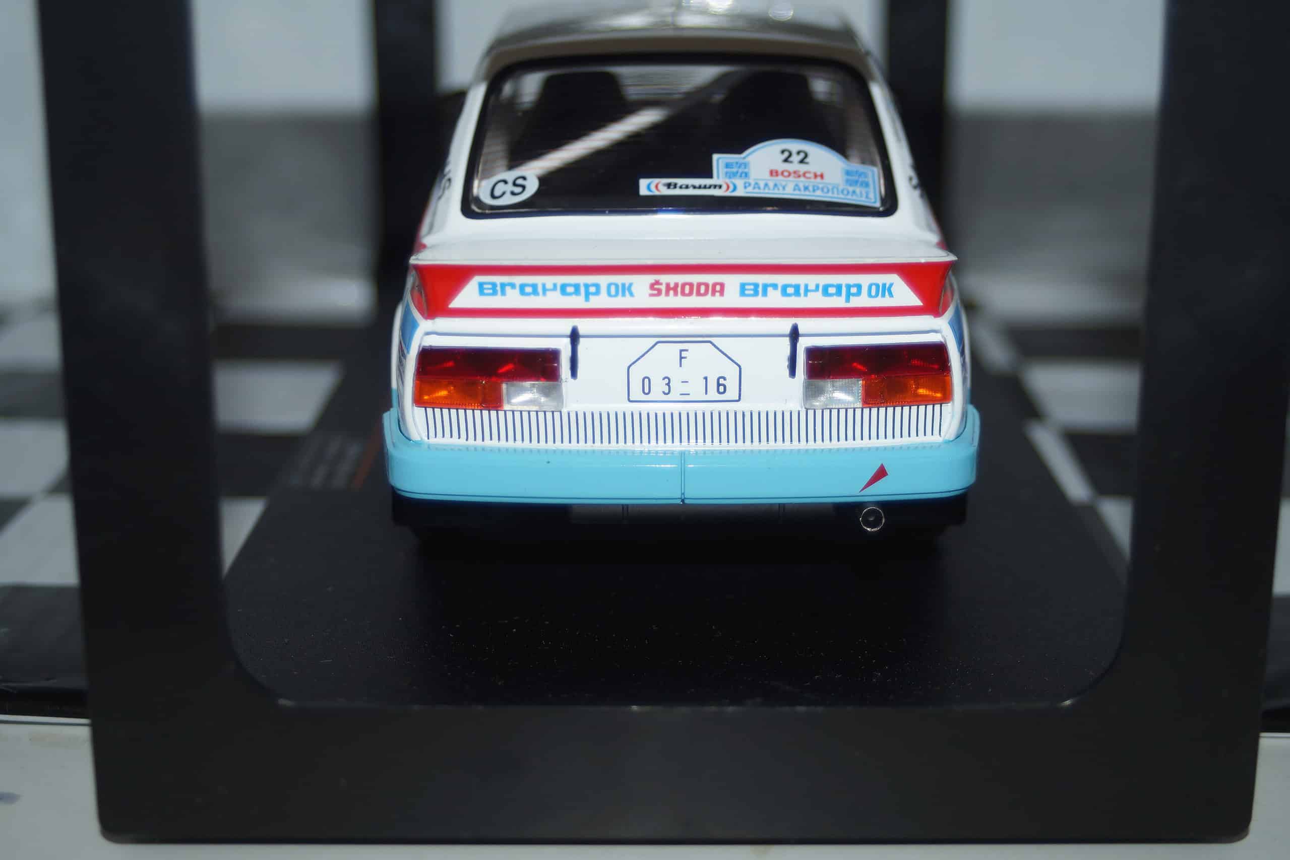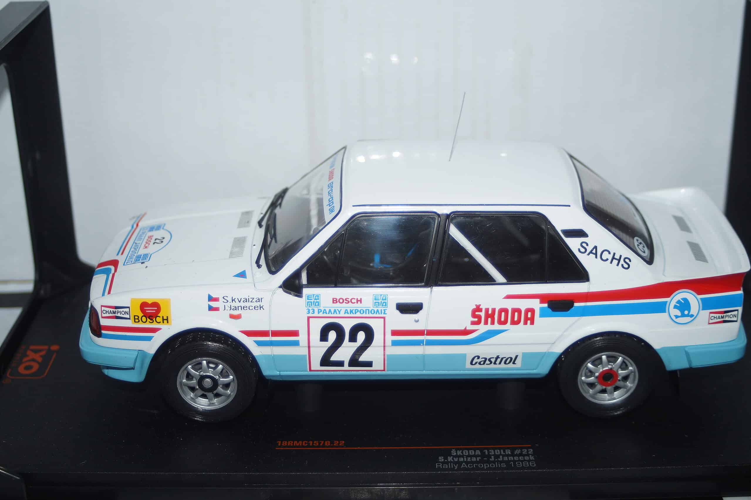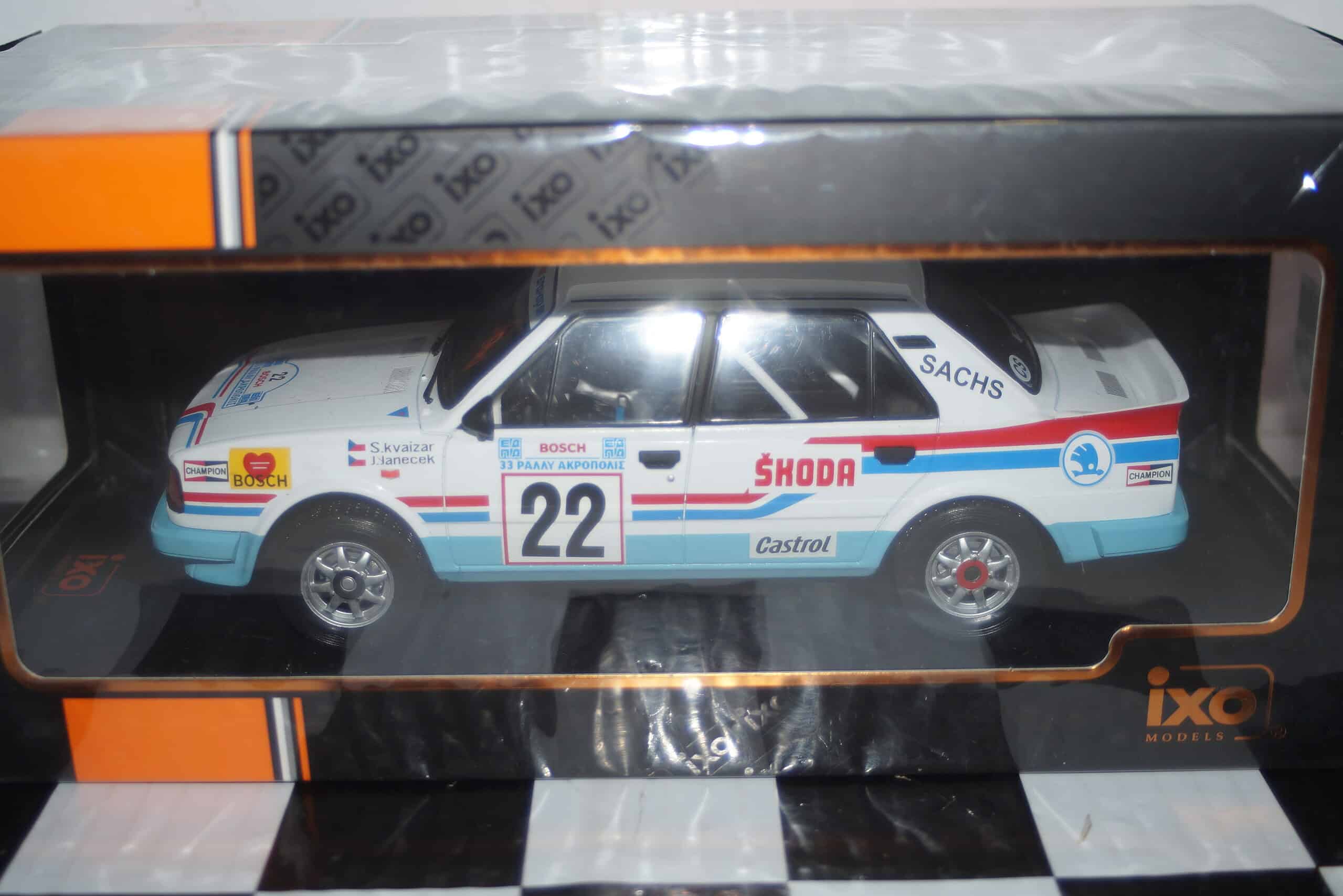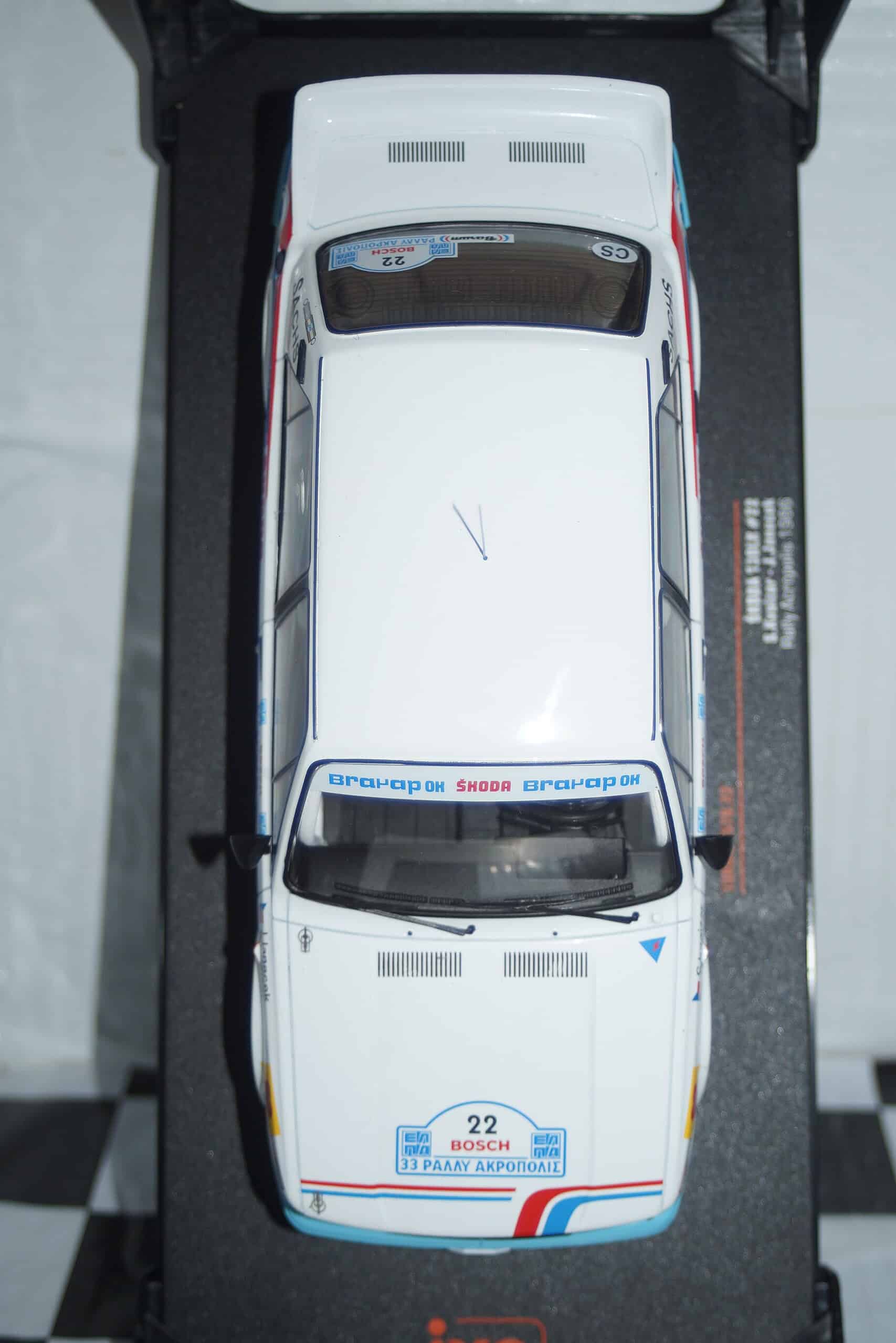This model car is a collectors replica of a Skoda 130LR Rally Acropolis #22 1986 Driven by S.Kvaizer / J.Janecek
