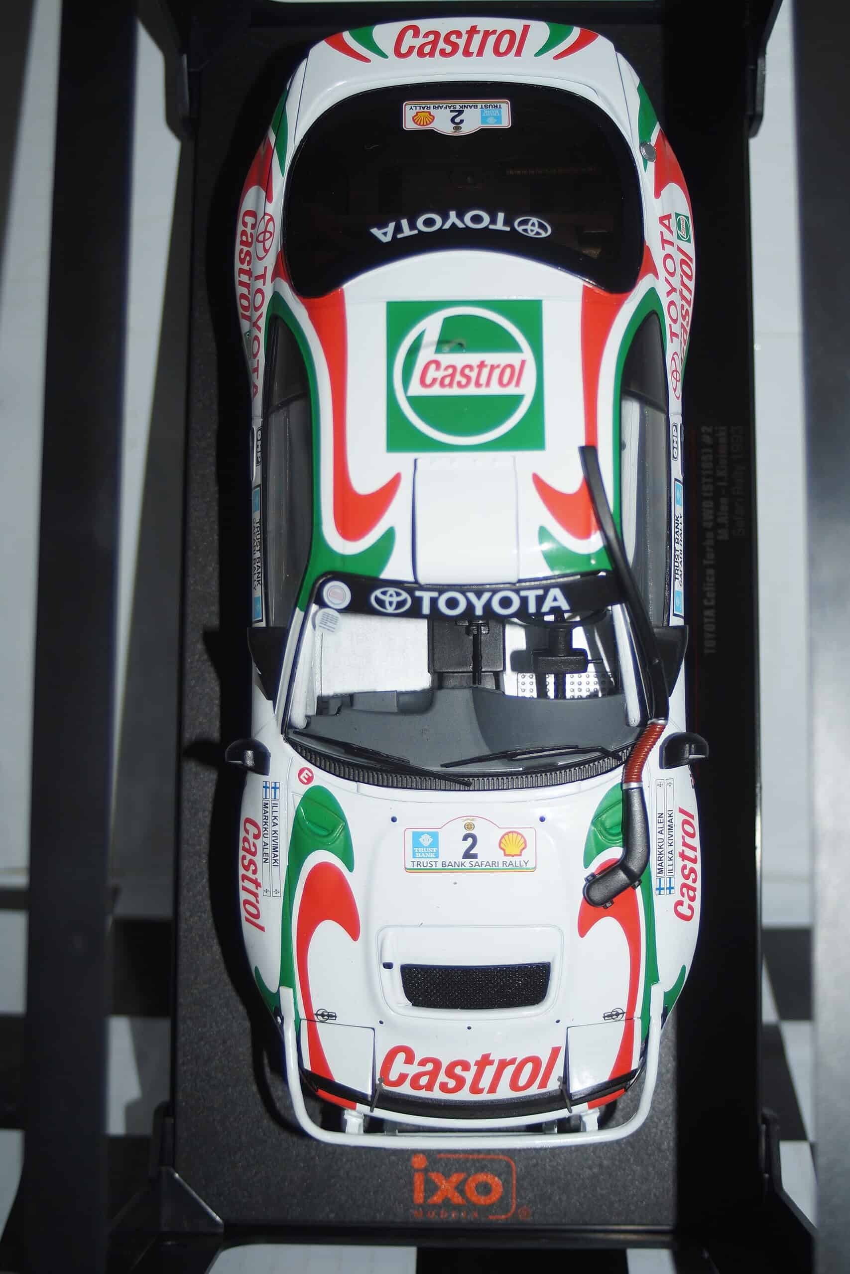 This Model Car is a collectors replica of a Toyota Celica Turbo 4WD (ST185) #2 Safari Rally 1993 and driven by M.ALEN / I.KIVIMAKI