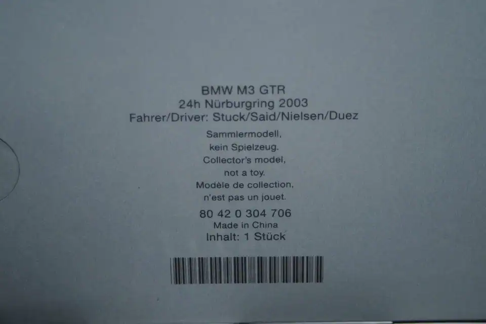 This Model Car is a collectors replica of an BMW M3 GTR 24h Nurburgring 2003 driven by Fahrer with Stuck/Said/Nielsen/Duez in dealer box