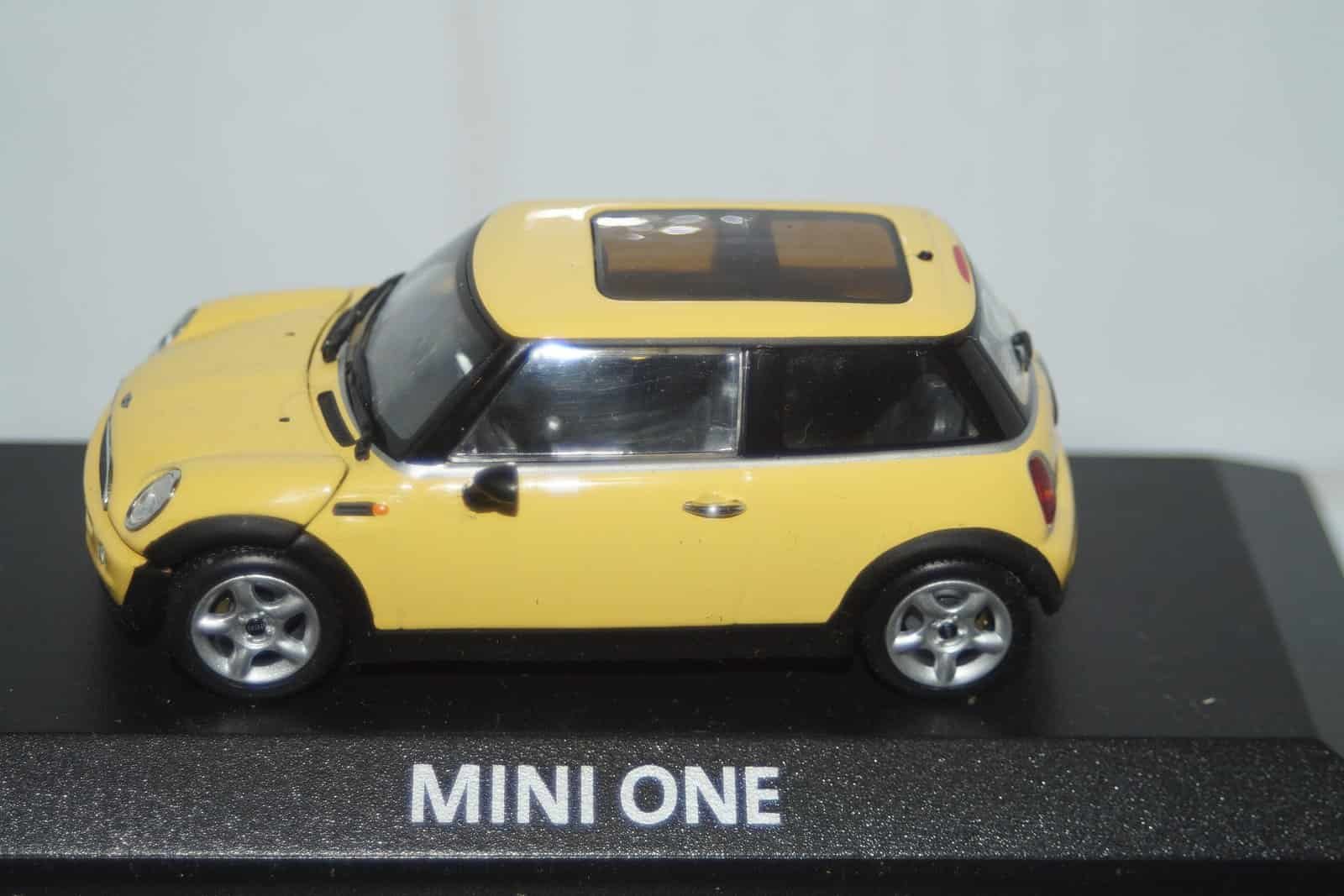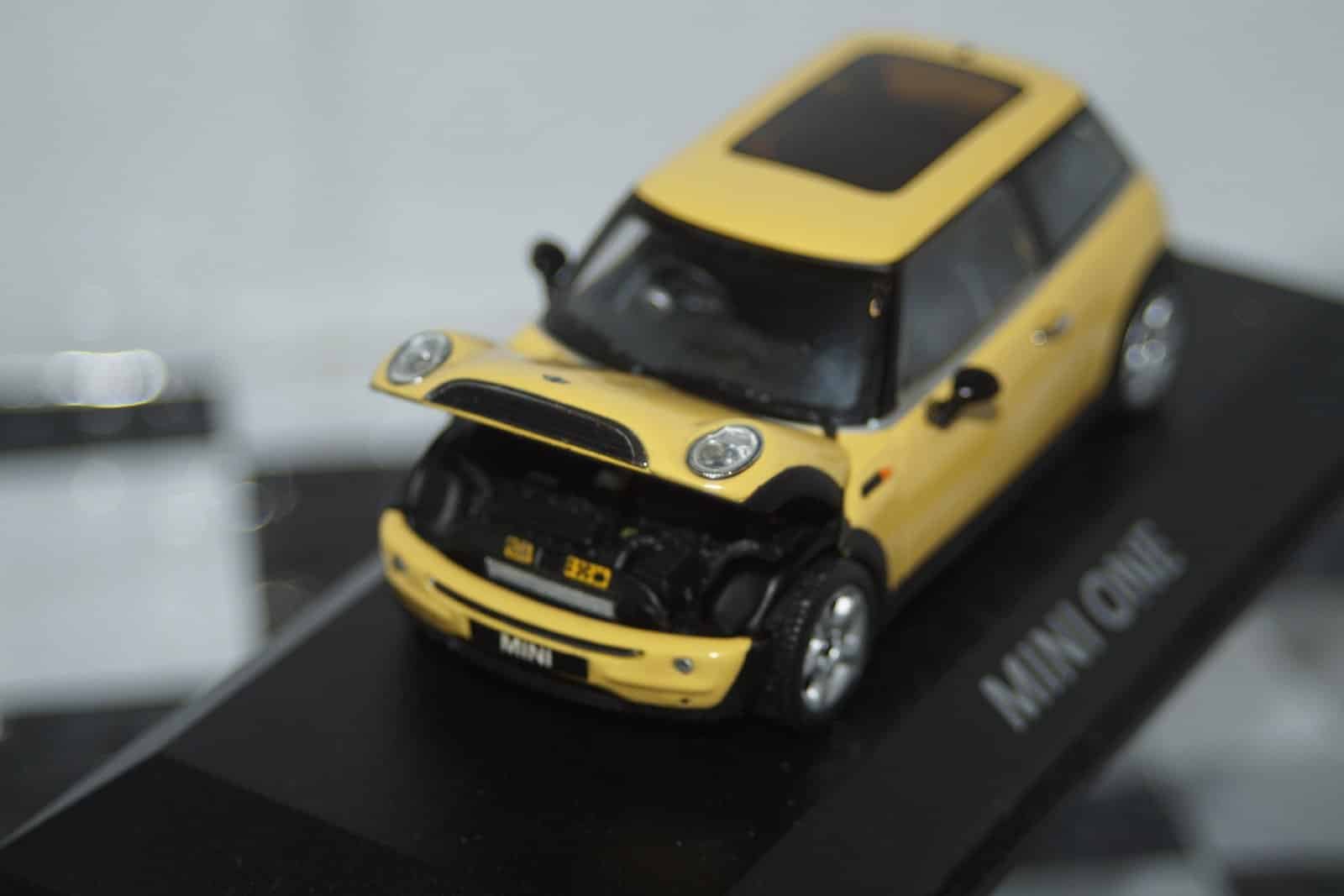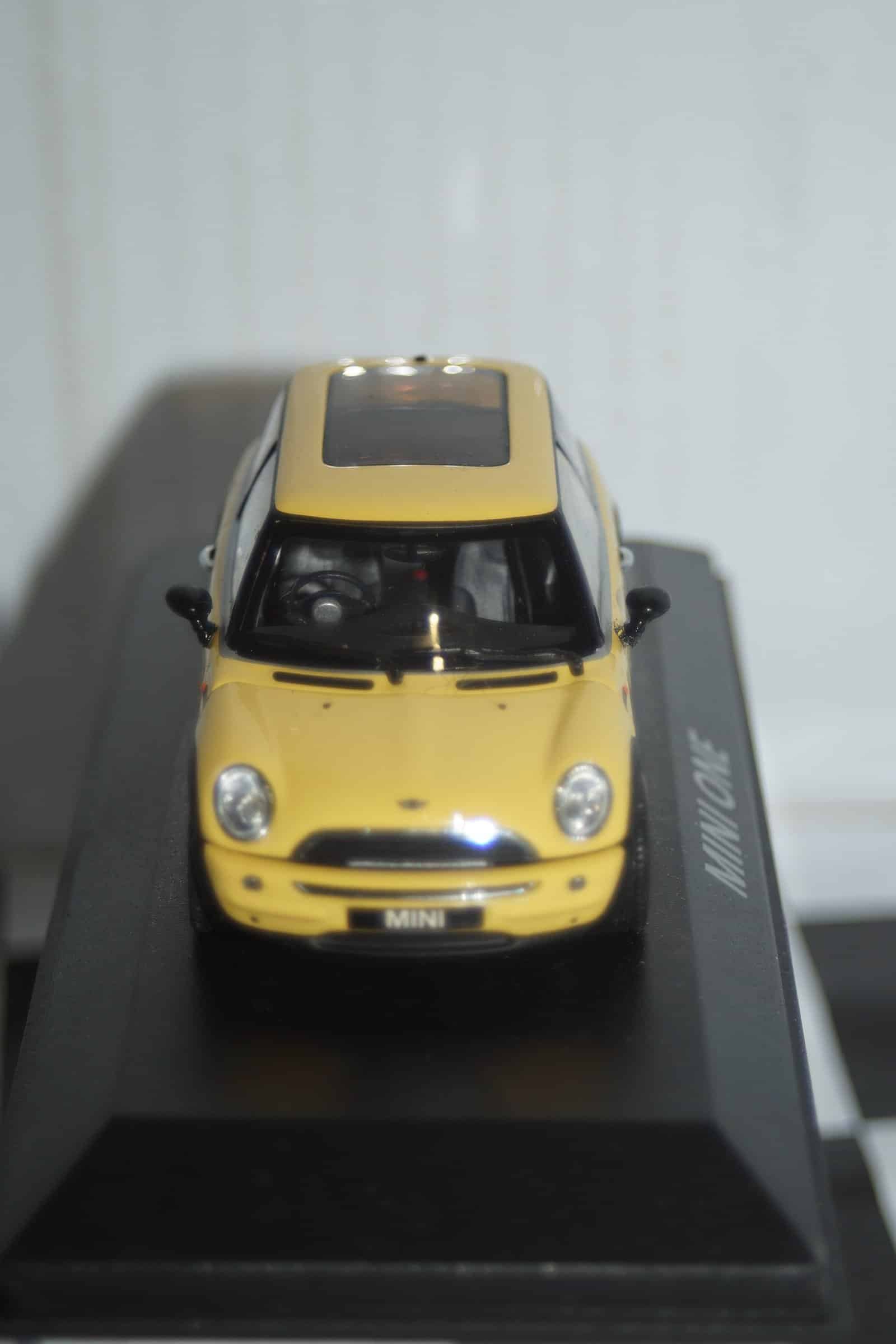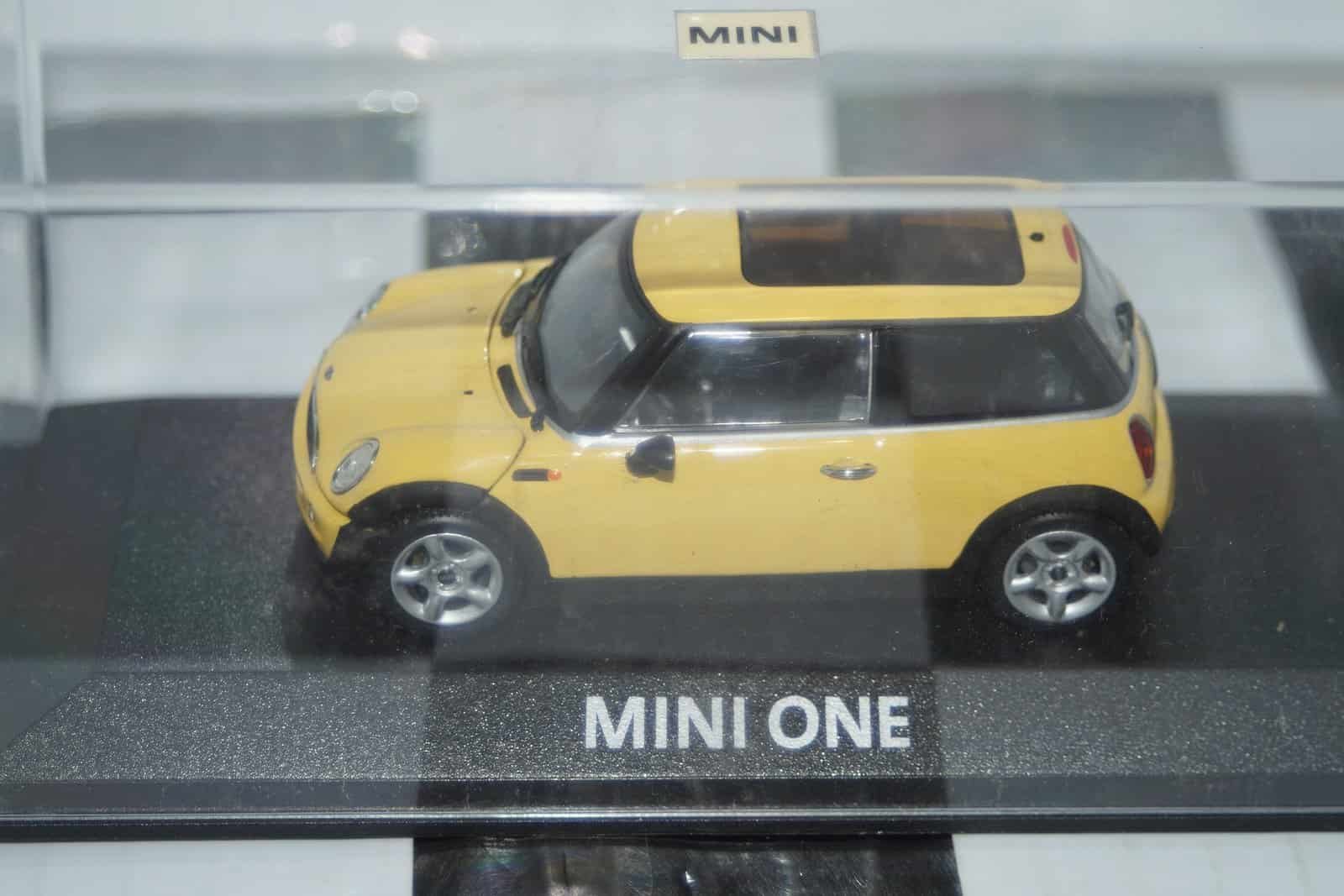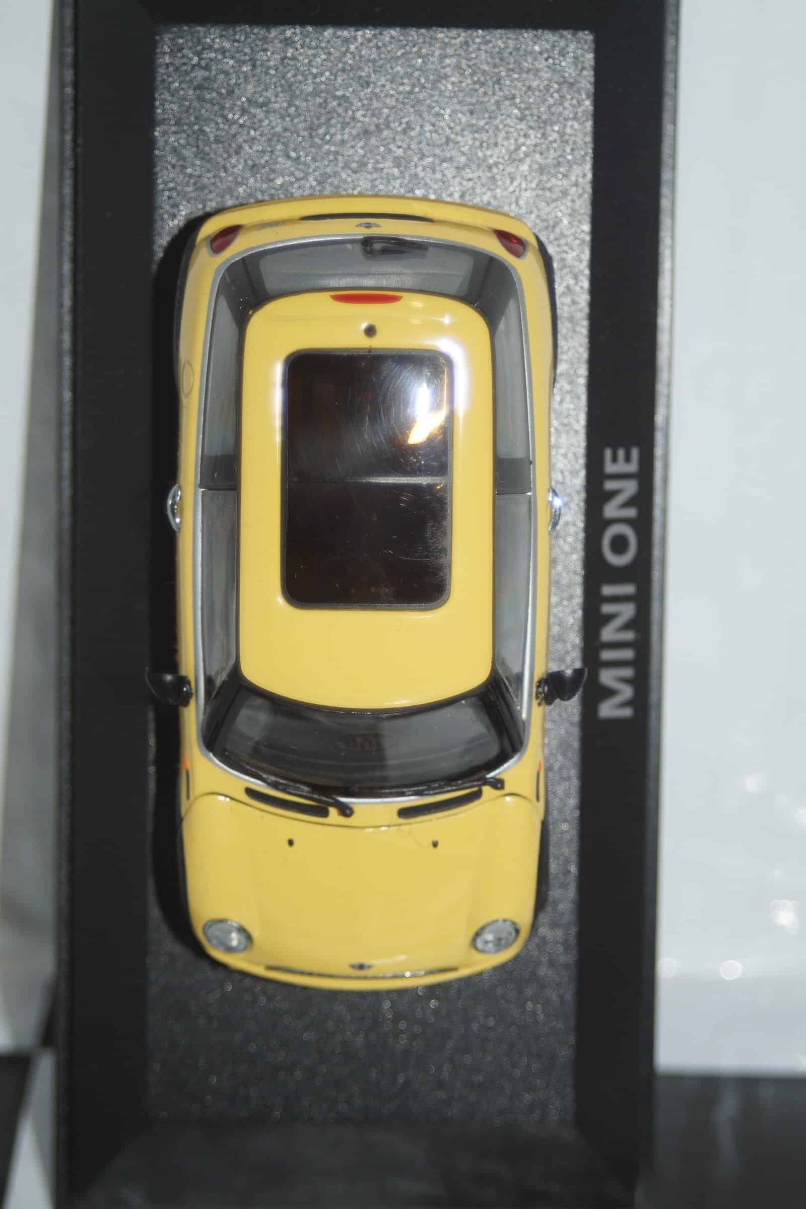 This Model Car is a collectors replica of an BMW Mini One (dealer edition) in yellow