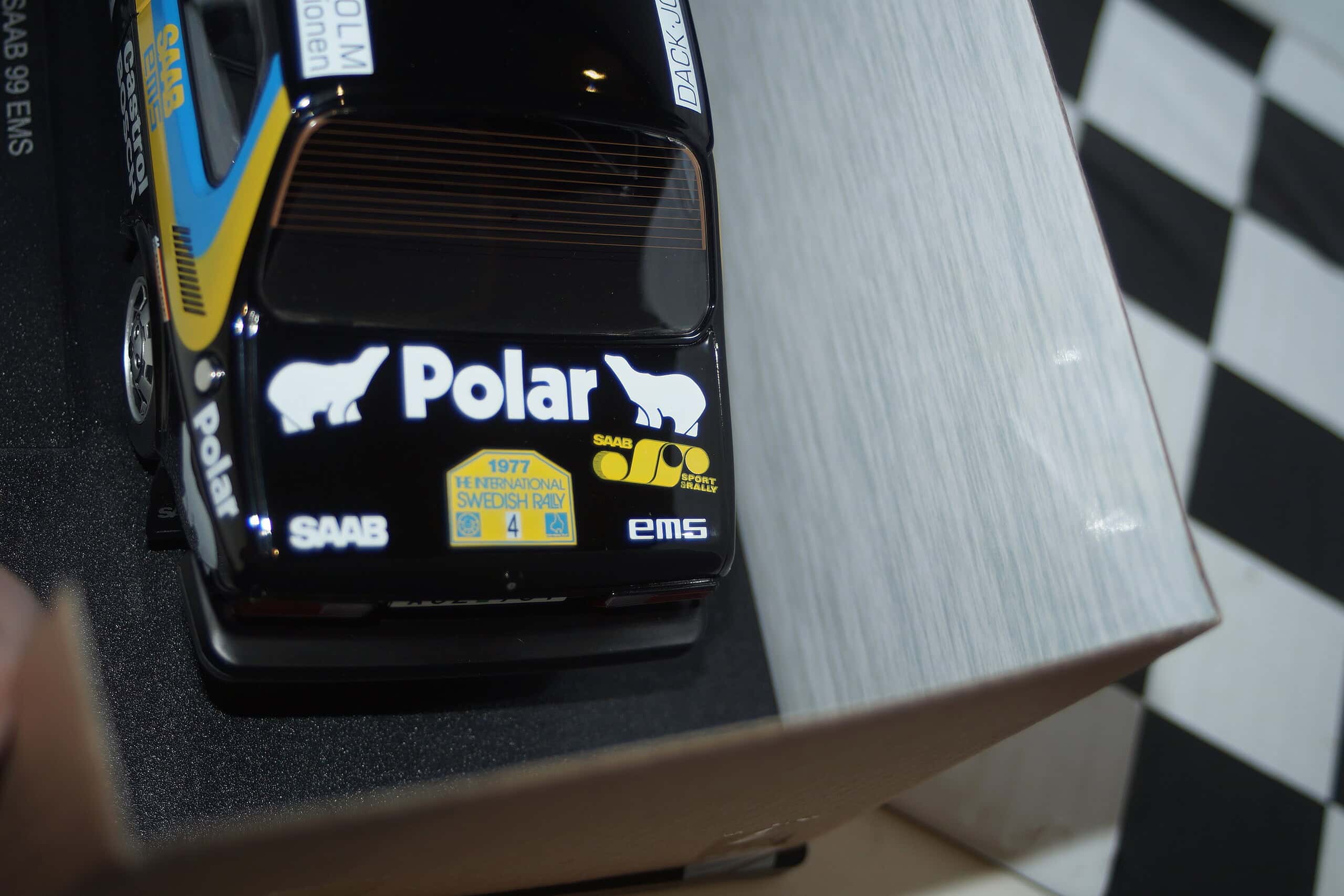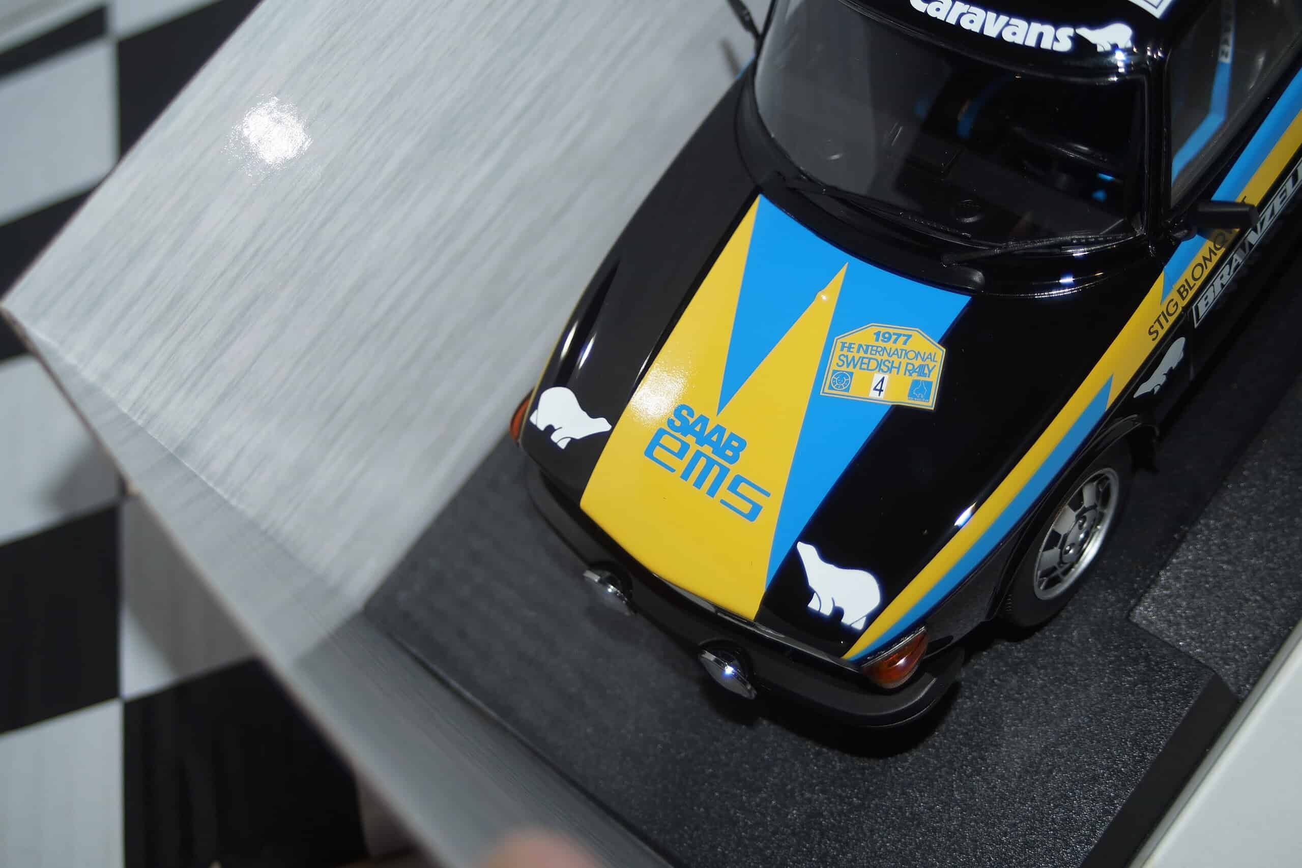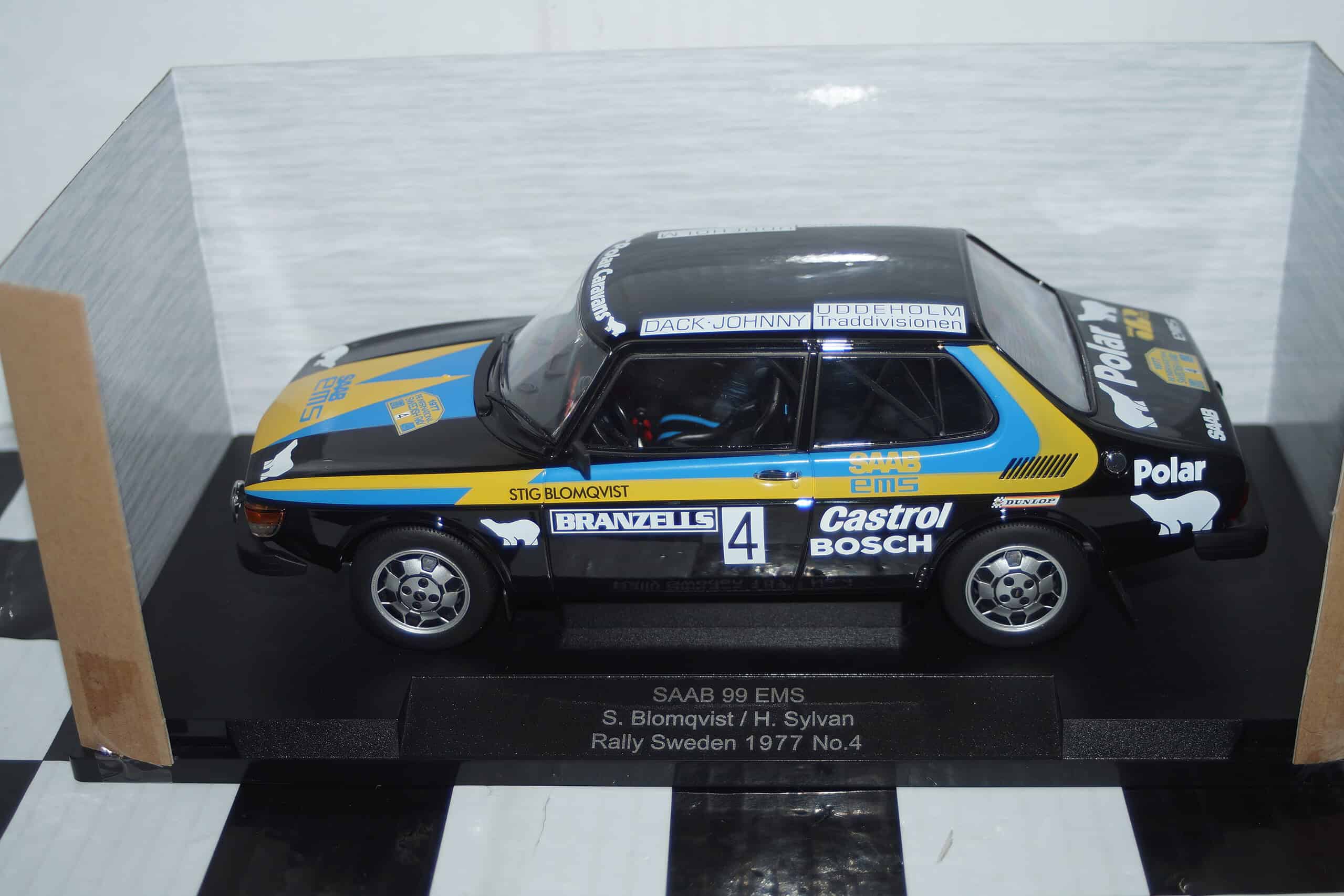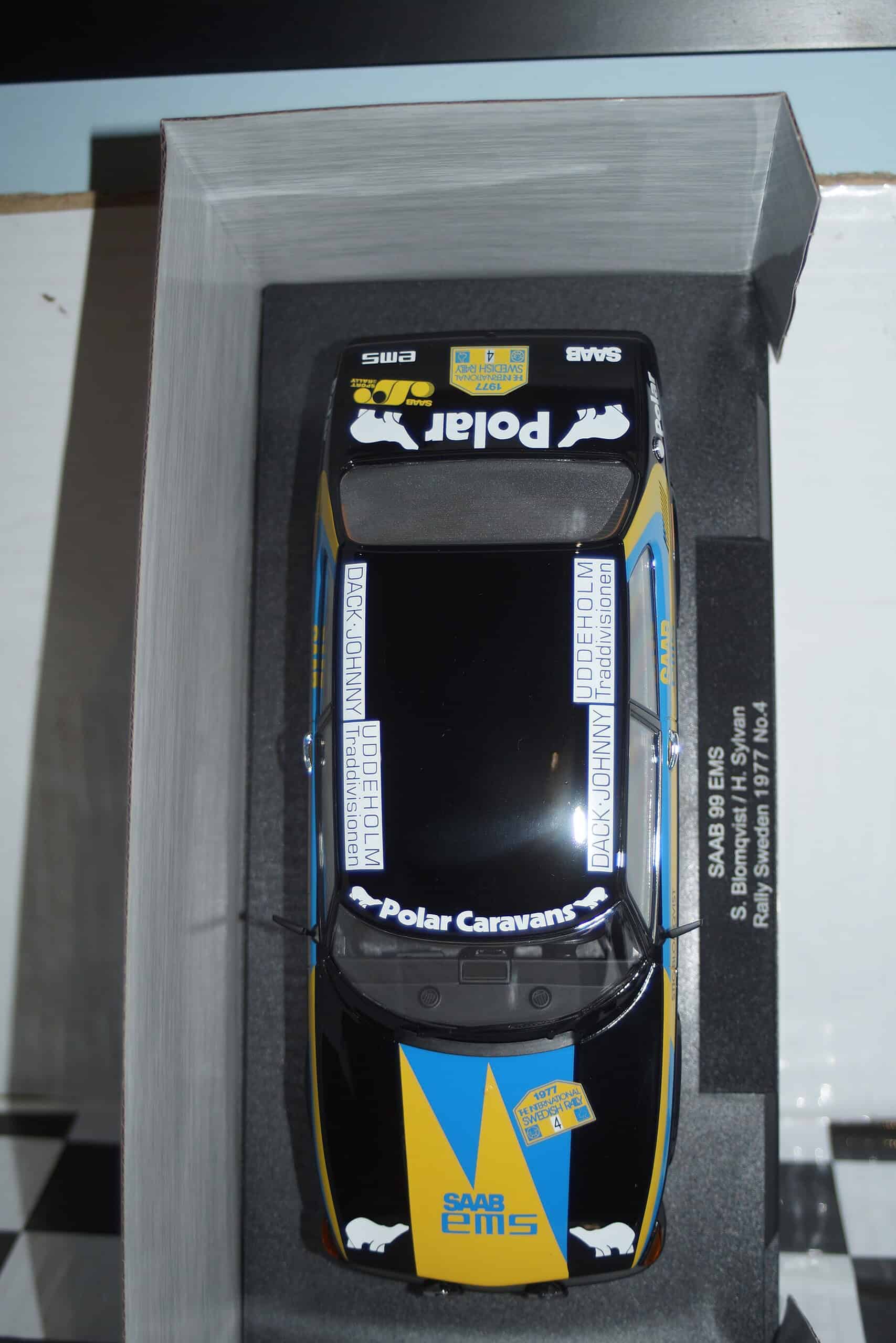 This Model Car is a collectors replica of an SAAB 99 in black from Rally Sweden 1977 #4 driven by S.Blomqvist / H .Sylvan