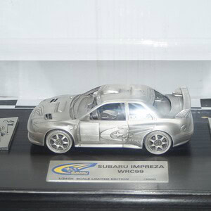 This Model Car is a collectors replica of a Subaru Impreza WRC 99 PEWTER Burns/Kankunen/ThiryThis Model car comes on a Black Wooden Base with Clear Acrylic Dome Case