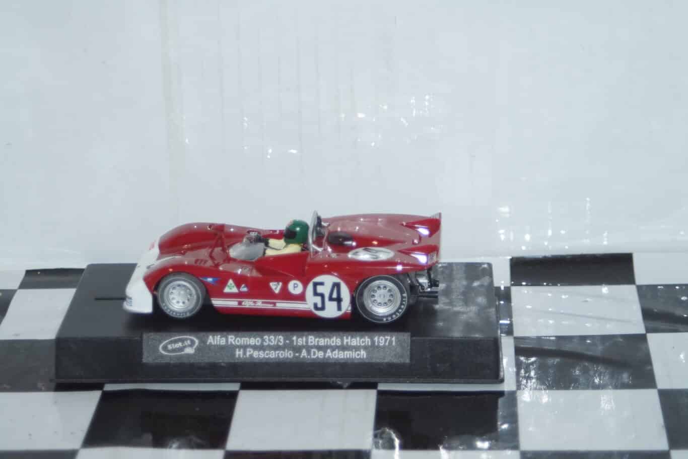 This Model Car is a collectors replica of a SLOT.IT ALFA ROMEO 33/3 BRANDS HATCH 1971 CA11C DRIVEN BY H.PESCAROLO/A.DE ADAMICH
