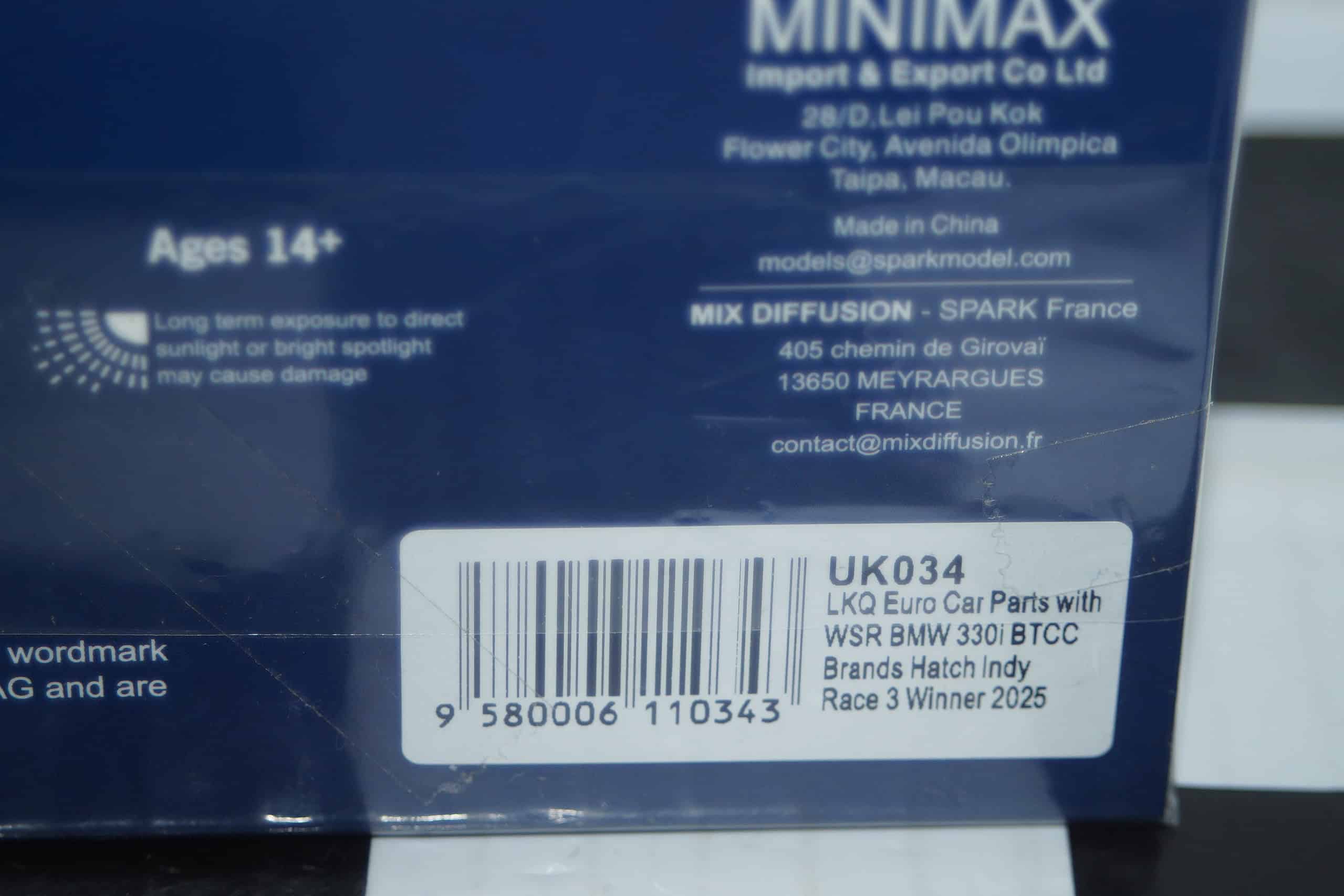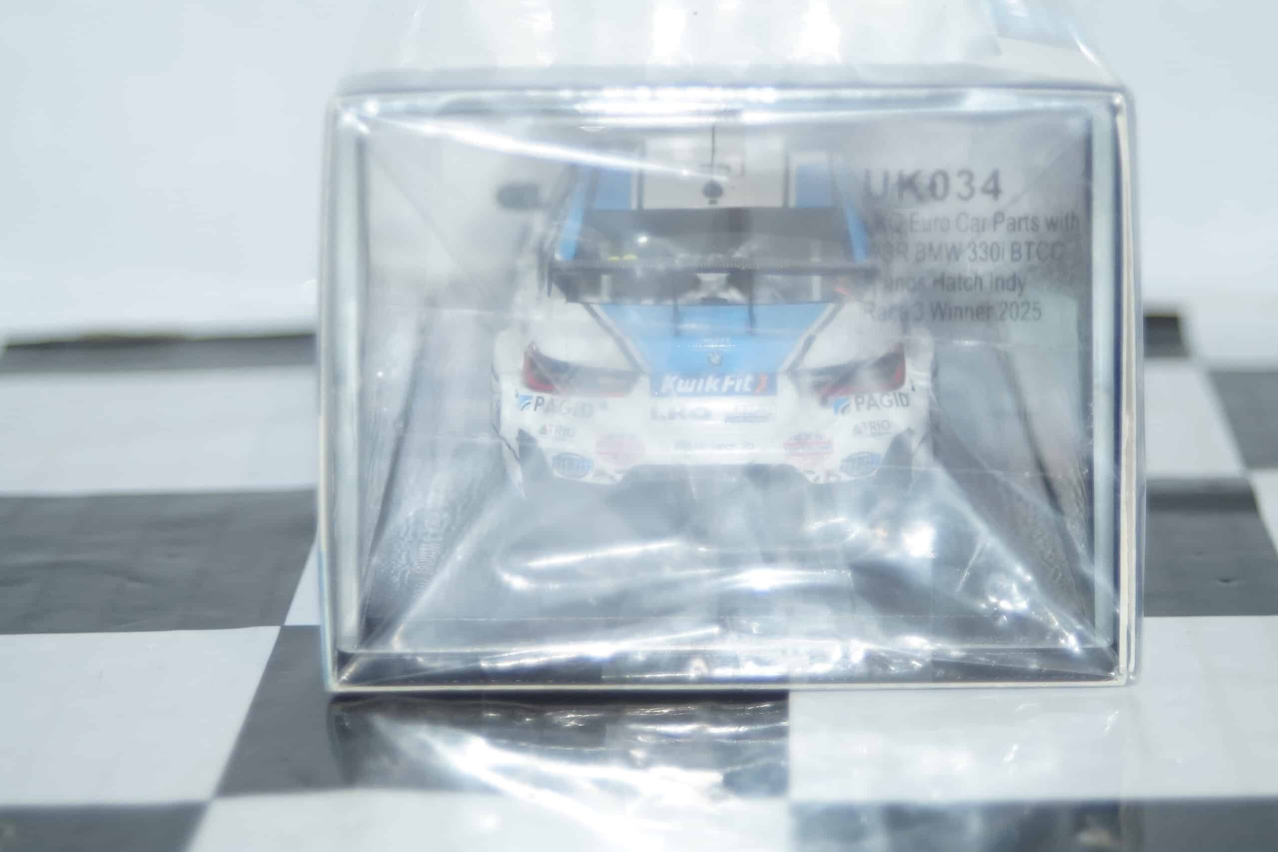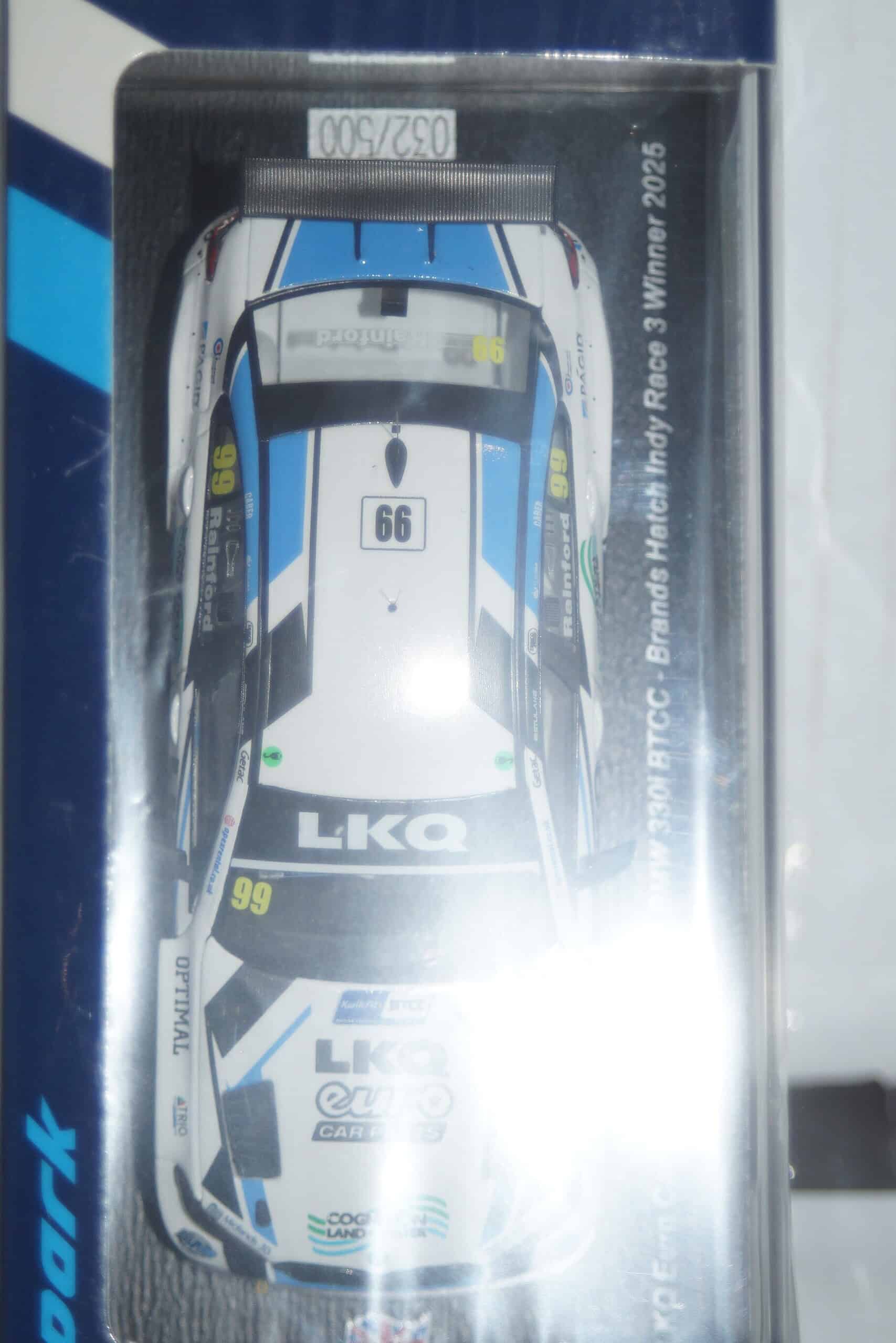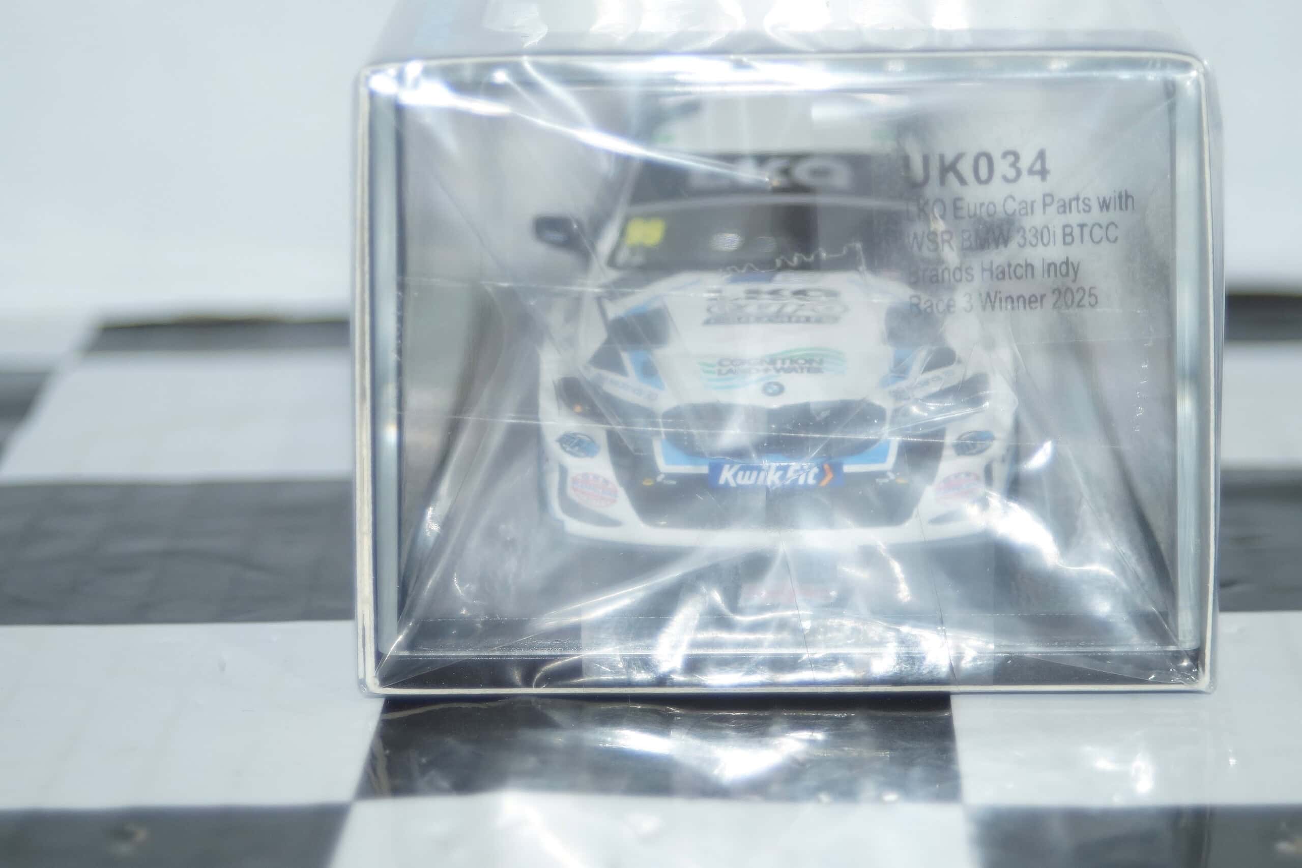 This Model Car is a collectors replica of a LKQ Euro Car Parts with WSR BMW 330i BTCC Brands Hatch Indy Race 3 Winner 2025 driven by Rainford #99