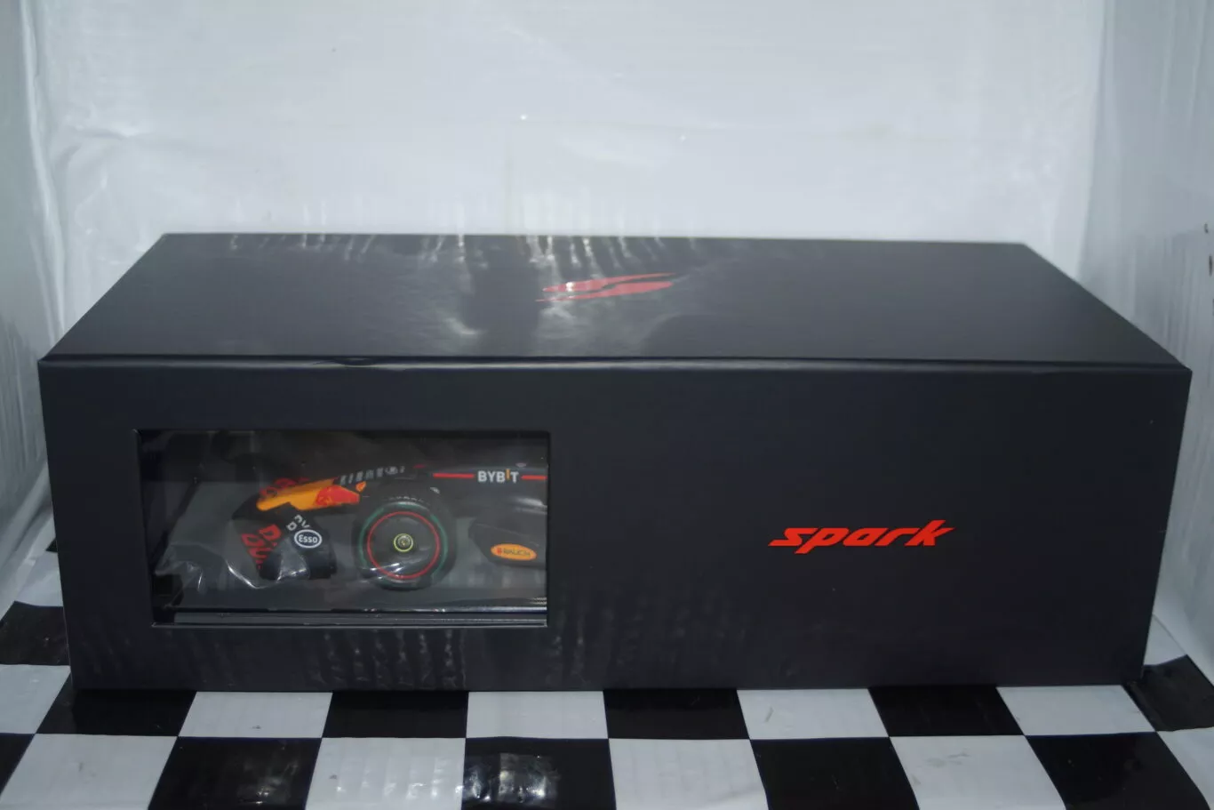 This model Car comes on a black plinth in a acryllic cover/case with a printed outer card