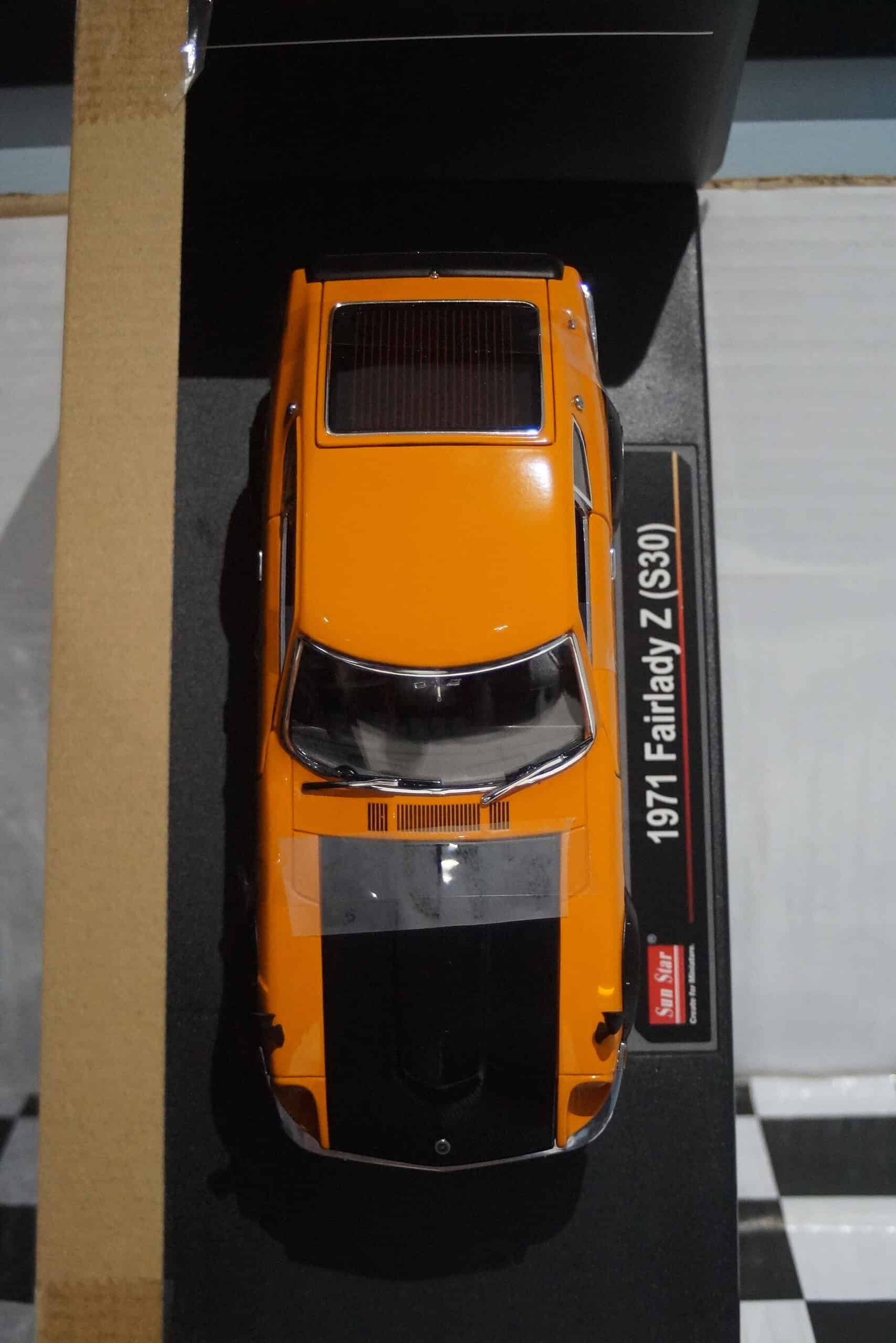 This Model Car is a collectors replica of a Nissan Fairlady Z (S30) from 1971 in Orange with black bonnet