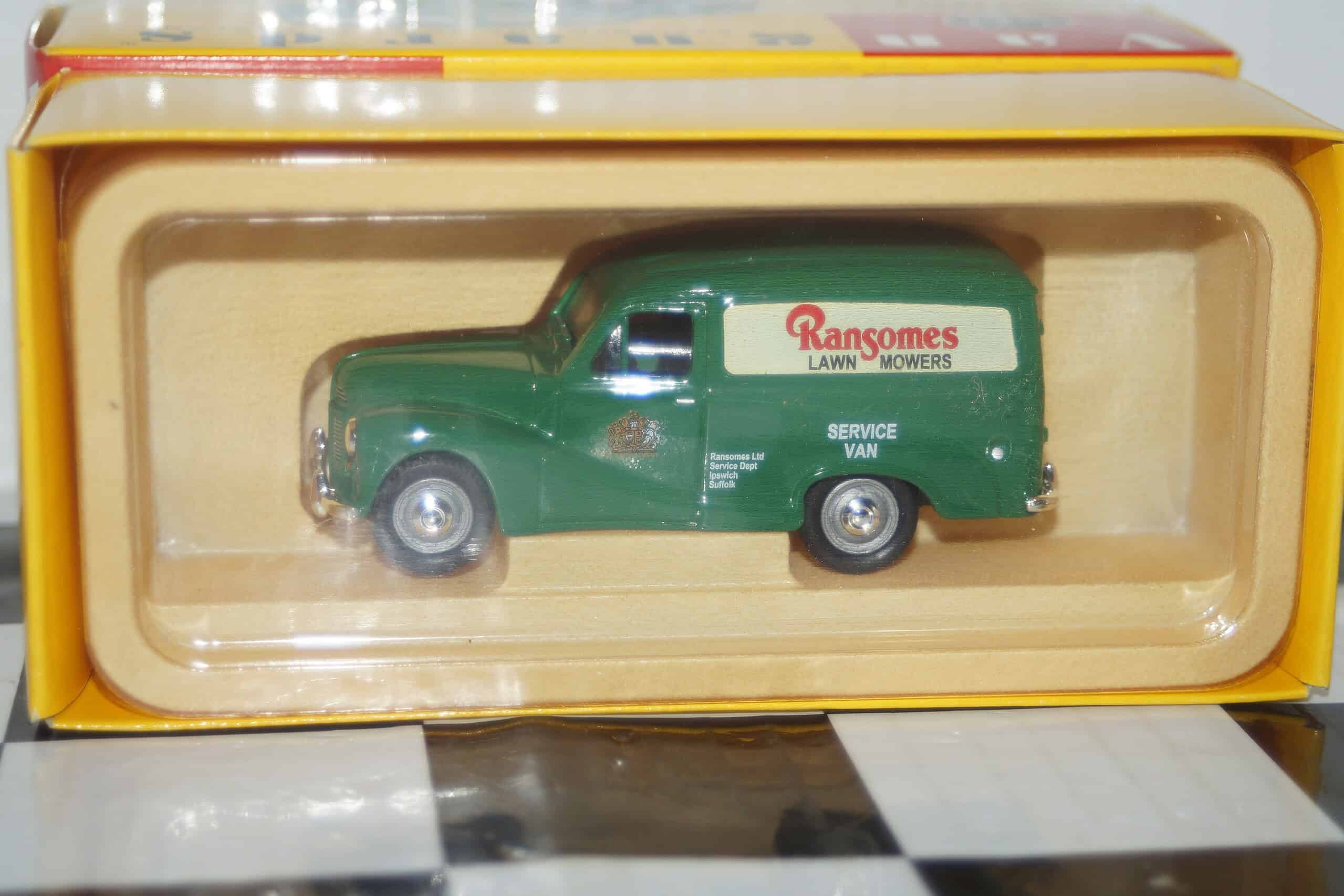 This Model Car is a collectors replica of Austin A40 Van Ransome Lawnmowers in Green