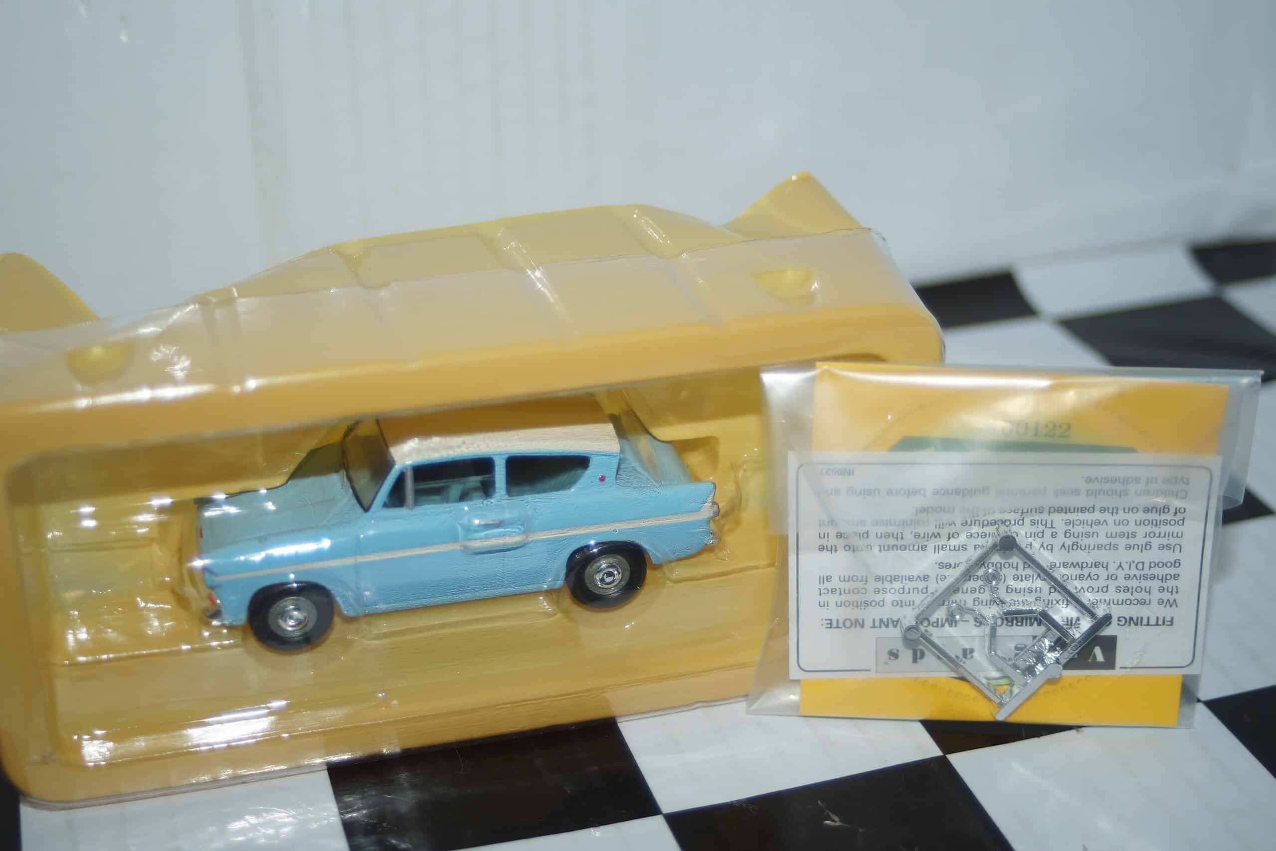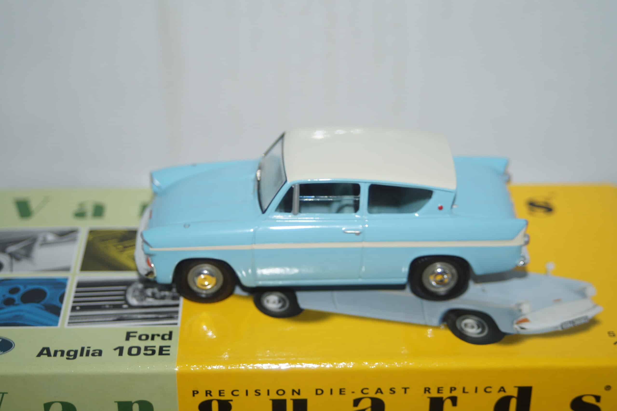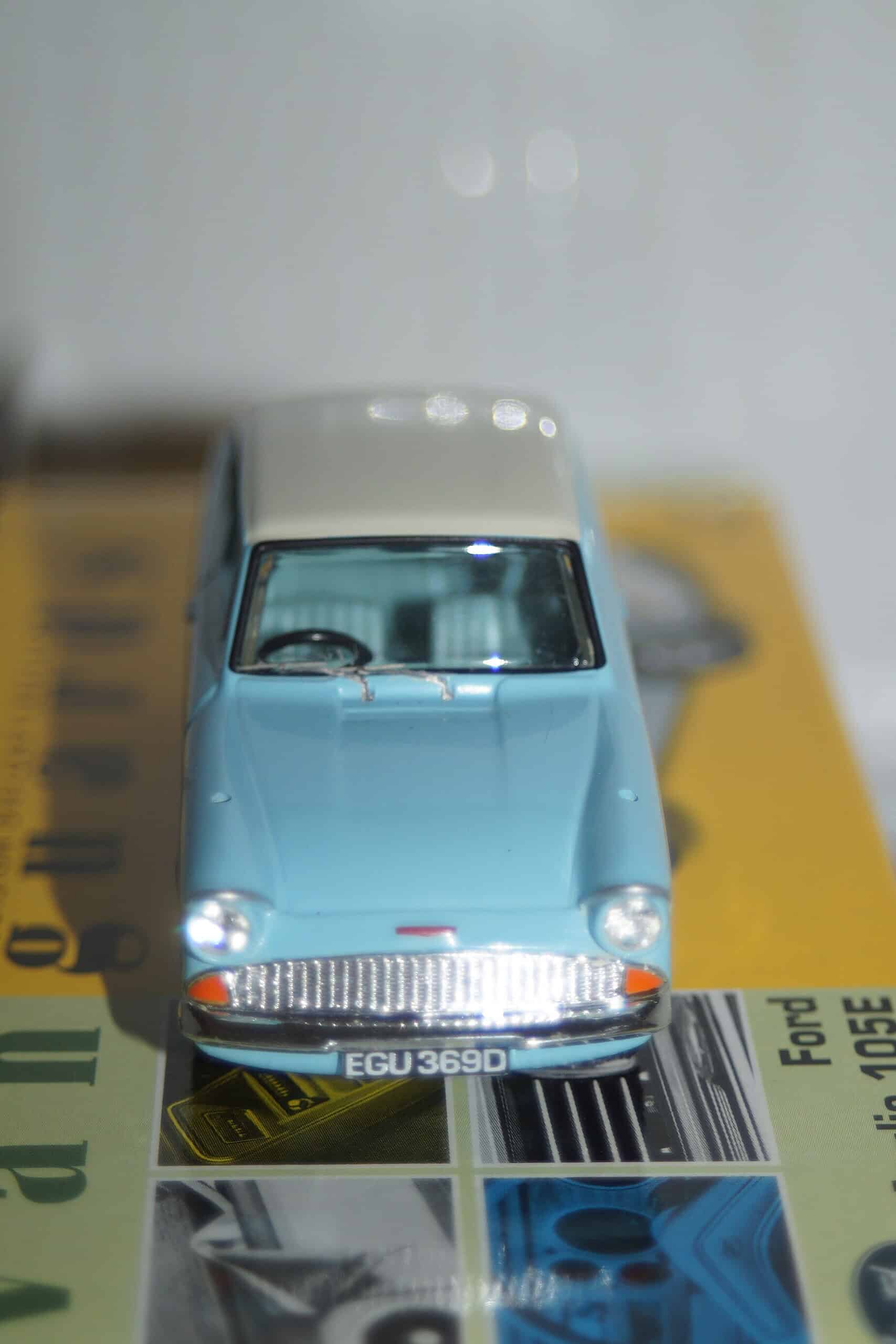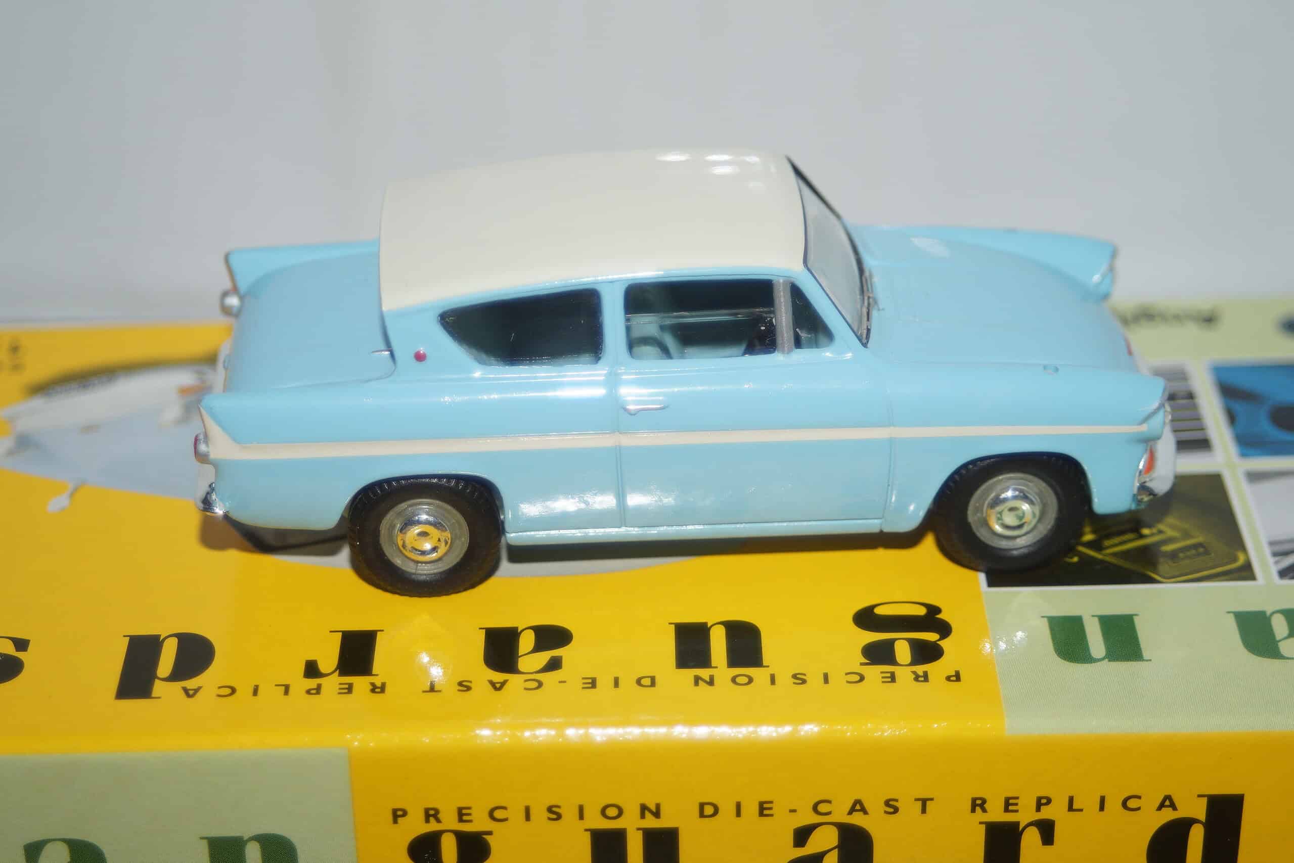 This Model Car is a collectors replica of a Ford Anglia 105E in Bermuda Blue /Ermine White