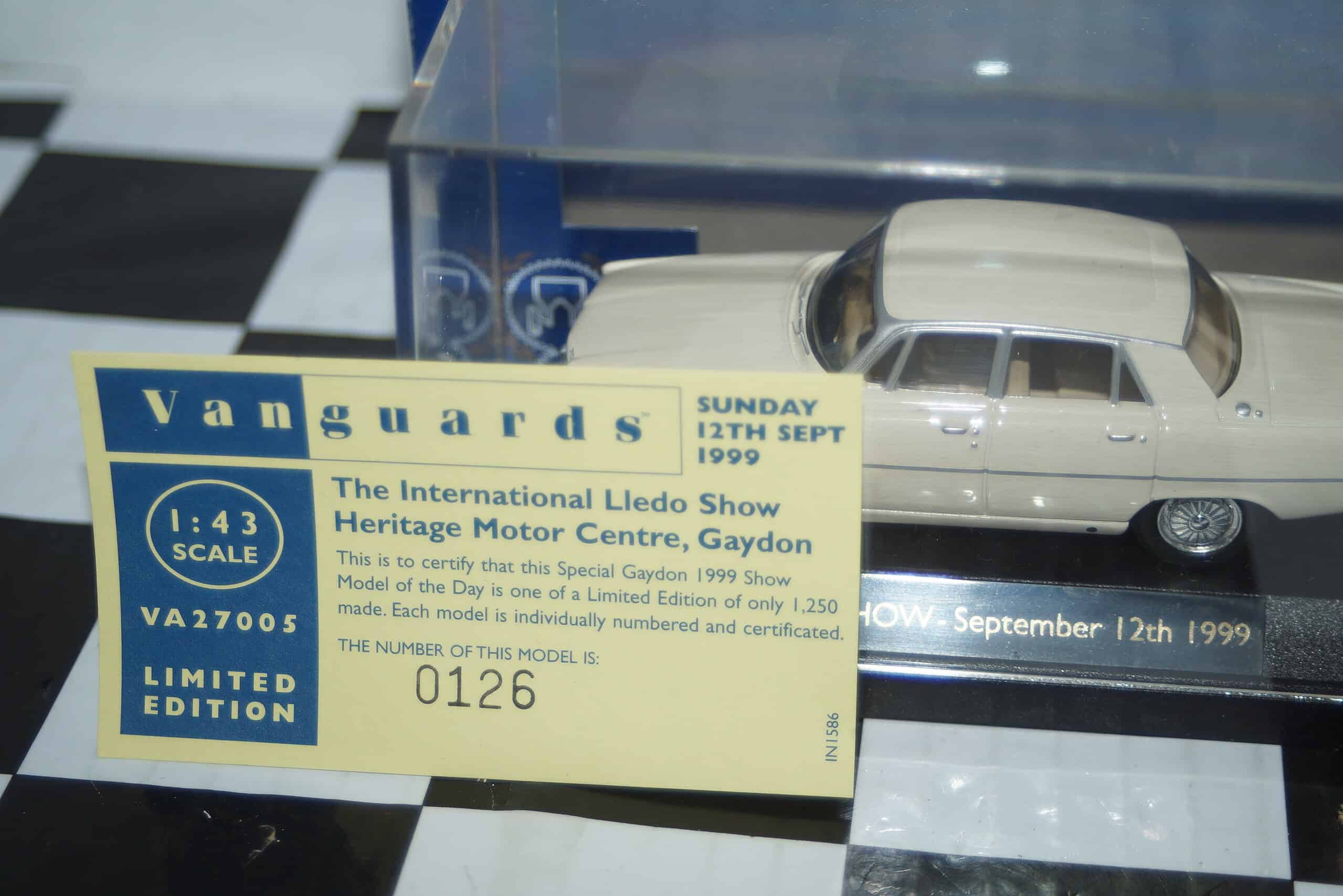 The Manufacturer of this Diecast metal Model Car is Vanguards Lledo and the size is 1/43rd Scale. The Product No is a limited edition number 126 of 1250 and was produced for the 1999 special Gaydon Motor show and was model of the day
